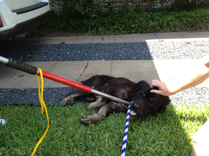 From there it was going to take 30 minute for the sedative to kick in, so we just sat back there in the yard with him getting him conditioned to us. He let me pet his head and he drank some water and allowed us to stay pretty close by. We finally decided he was sedated enough to trap him up on the deck. We didn’t think he would be coordinated enough to get off the deck, but he did. Some quick moves with the slip leash by the fence and we had him. That was followed by a quick move with the catch pole and that closed the deal. Now he could not bite the leash off like he did the other night, although he sure tried! He bit the heck out of the catch pole. He broke a tooth on the pole.