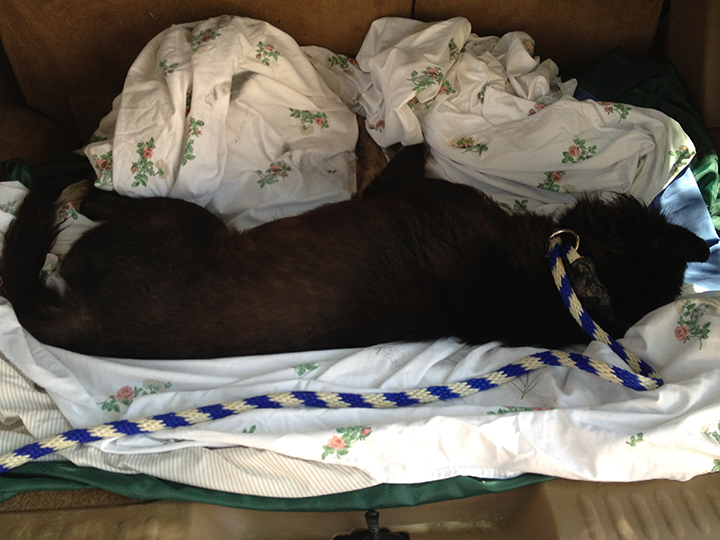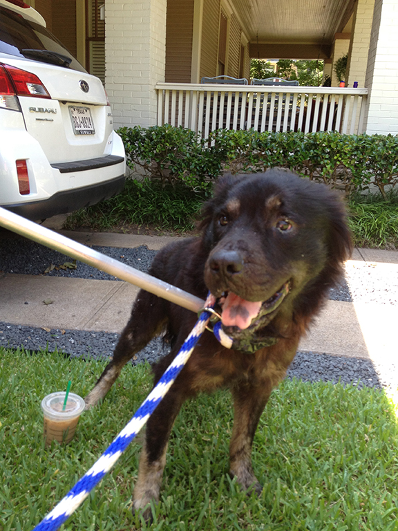 Here’s how the capture went down: We found him lying on Rick’s porch. He was not that interested in taking treats from me, he definitely remembered me from our encounter the other night. Rick leveraged his relationship with him and with his dog and got him to follow him into his back yard. Once the dog, who we are now calling Sombra, was in the yard, we all just hung out. We tried to feed him a pill pocket with a sedative, but he wasn’t interested. We change our treat. Magic cheese was the winner – he ate the sedative.