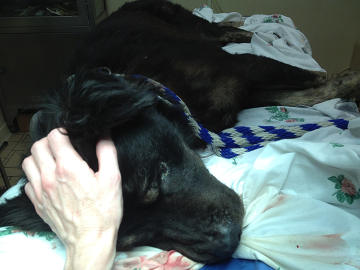 Dr May was able to quickly jab him with a sedative in the butt with our home made syringe pole, but the needle bent (note to self for next time – heavier gage needle) She did manage to get enough sedative in him for him to start to calm down (after a little protest). We gave him a second shot and he was out like a light. With some help from the neighbors, we loaded him up in the car and took him to the clinic.