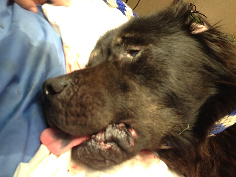 Below is Dr May’s assessment of the dog. “My formal assessment of Rott mix. At least 5 years of age, heavy wear on his front teeth from fence or chain chewing over the years. Broken left upper premolar that needs to be extracted. Intact male, needs to be neutered prior to release to foster in the event he escapes. Has some likely benign skin masses along back that are not beautiful but are not any immediate harm. Has generalized hair loss and very thickened chronic allergic skin disease over rump and tail head. Covered in fleas. Deep and superficial skin scrapings were negative for Demodex or Sarcoptic. Fleas were treated and removed, medication was applied that will kill any possible Sarcoptic mange mites or ear mites present and continue to provide flea protection for the month.