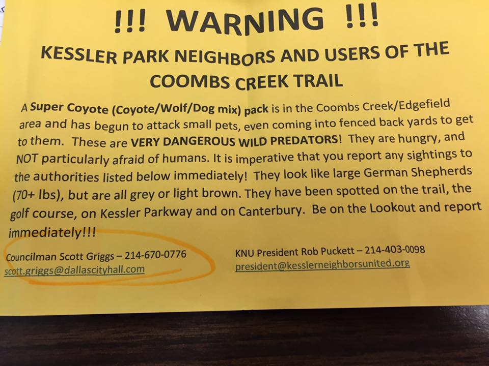 “Super coyotes” – it’s a thing. Loose dogs and coyotes will readily breed if given the opportunity. The cross breeding creates a predator that is not afraid of people and is quite large and powerful. North Oak Cliff is reported to have one that will climb a fence and be so bold as to snatch up your small dog right in front of you. How can you prevent such a tragedy? Expect the City to pick up all loose dogs. Loose dogs and coyotes together are bad news. Coyotes are part of our natural eco system – loose “domestic dogs” are not part of the eco system. They are companion animals bred to be with humans. They are not meant to roam neighborhoods, fight for resources, and breed with coyotes.