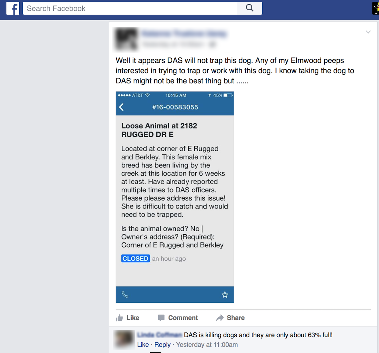 Let’s not forget about the botched dog dumping investigation in Elmwood where the City accidentally took the evidence to the landfill and the failed cruelty investigation of a long time chronically loose intact male dog. The dog owner was able to renew the dog’s intact license after three separate impoundments of the intact dog. It was also known by DAS that the dog was a trained protection, or attack dog. The dog was allowed to live in deplorable conditions and wander the neighborhood without any serious repercussions for at least a year and a half. Even after a citizen turned the medically neglected dog in directly to Deputy Chief Sherwin at the shelter, the owner was allowed to renew the neglected dog’s intact license and take the dog home without getting it medical attention or without neutering the dog. #SameShitDifferentDay